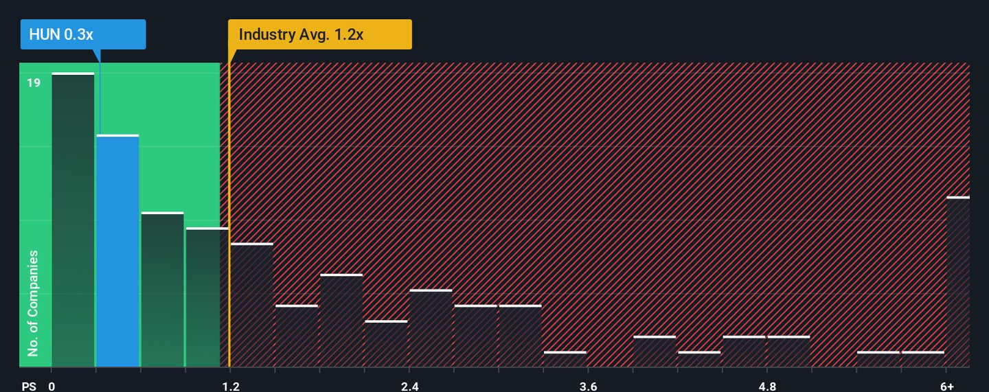 Our valuation work also looks at Huntsman through its price to sales ratio of 0.3 times, which is far below both peers at 0.8 times and the wider US Chemicals industry at 1.2 times, and even under a fair ratio of 0.7 times. Is the market overreacting to near term pain?
