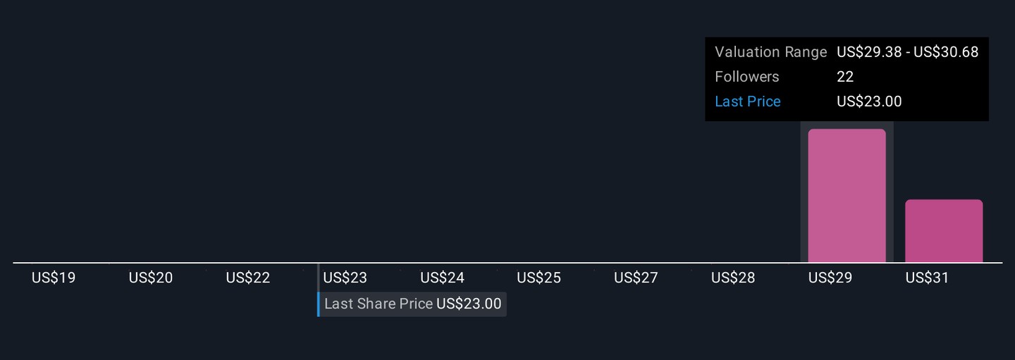 Four Simply Wall St Community valuations span roughly US$19 to about US$31.98, underlining how far apart individual expectations can be. When you set those side by side with Gentex’s exposure to China decontenting risk, it becomes clear why checking several viewpoints on the stock’s possible trajectory can matter for your own assessment.