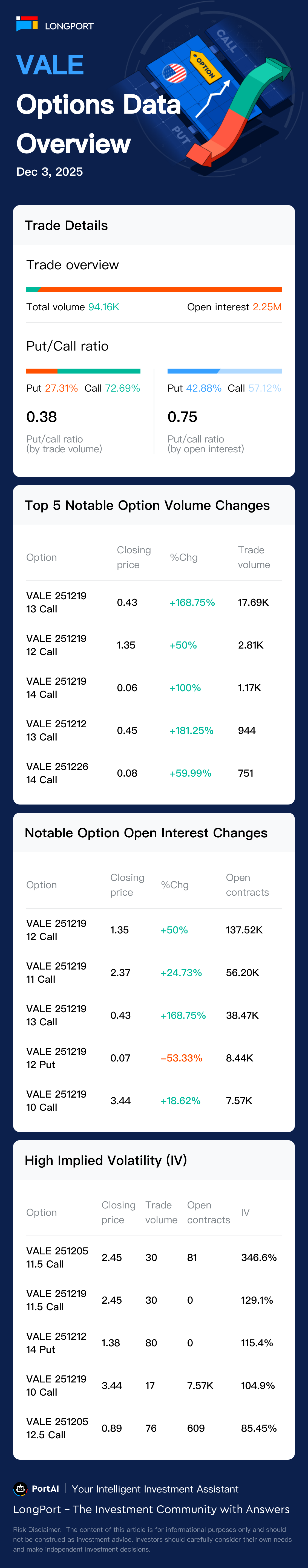 On December 3, Eastern Time, Vale SA options saw a total of 94159 contracts traded, with calls accounting for 72% and puts making up 27%.