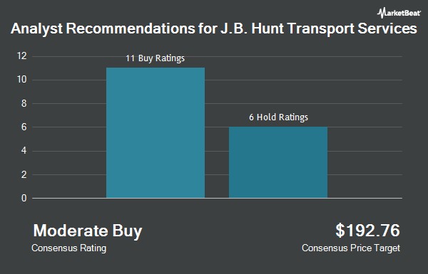 Shares of J.B. Hunt Transport Services, Inc. (NASDAQ:JBHT - Get Free Report) have been assigned an average recommendation of "Moderate Buy" from the twenty-two brokerages that are currently covering the company, Marketbeat Ratings reports. Eleven investment analysts have rated the stock with a hold rating, ten have issued a buy rating and one has assigned a strong buy rating to the company. The average twelve-month target price among brokerages that have covered the stock in the last year is $166.30.