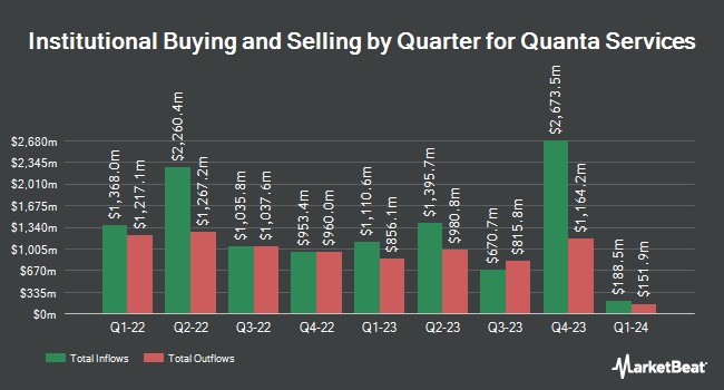 Several other institutional investors and hedge funds have also recently added to or reduced their stakes in the business. Old Port Advisors increased its position in shares of Quanta Services by 0.7% in the second quarter. Old Port Advisors now owns 3,944 shares of the construction company's stock valued at $1,491,000 after acquiring an additional 26 shares during the last quarter. Ashton Thomas Private Wealth LLC increased its position in shares of Quanta Services by 1.2% during the 2nd quarter. Ashton Thomas Private Wealth LLC now owns 2,250 shares of the construction company's stock worth $851,000 after purchasing an additional 26 shares during the last quarter. RiverPark Advisors LLC raised its stake in shares of Quanta Services by 29.3% during the 2nd quarter. RiverPark Advisors LLC now owns 128 shares of the construction company's stock worth $48,000 after purchasing an additional 29 shares in the last quarter. Pinnacle Wealth Planning Services Inc. boosted its holdings in shares of Quanta Services by 3.5% in the 1st quarter. Pinnacle Wealth Planning Services Inc. now owns 951 shares of the construction company's stock valued at $242,000 after buying an additional 32 shares during the last quarter. Finally, PFG Private Wealth Management LLC boosted its holdings in shares of Quanta Services by 4.1% in the 2nd quarter. PFG Private Wealth Management LLC now owns 808 shares of the construction company's stock valued at $305,000 after buying an additional 32 shares during the last quarter. 90.49% of the stock is owned by institutional investors.