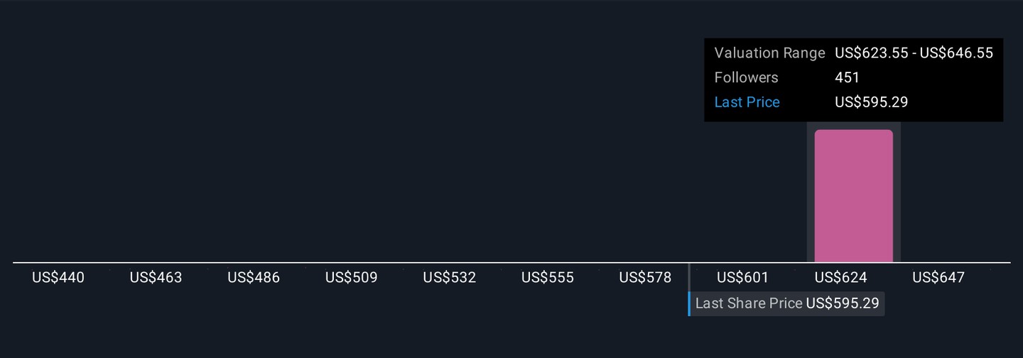 Earlier we mentioned that there is an even better way to understand valuation, so let us introduce you to Narratives, a simple way to turn your view of Mastercard into a story that connects assumptions about its future revenue, earnings and margins to a concrete fair value estimate. A Narrative on Simply Wall St is your structured perspective on a company, where you spell out what you think will drive the business, translate that into a financial forecast, and then see what price those numbers imply. Narratives live inside the Community page on Simply Wall St, used by millions of investors, and make it easy to compare your Fair Value to the current share price so you can decide whether Mastercard looks like a buy, hold or sell. Because Narratives are updated dynamically as new news, earnings or guidance arrives, your fair value can evolve alongside the story. For example, one Mastercard Narrative might lean bullish with a fair value near $690 based on accelerating digital payment growth and rising margins, while a more cautious investor could justify a fair value closer to $520 if they think regulation and new payment rails will cap long term profitability.