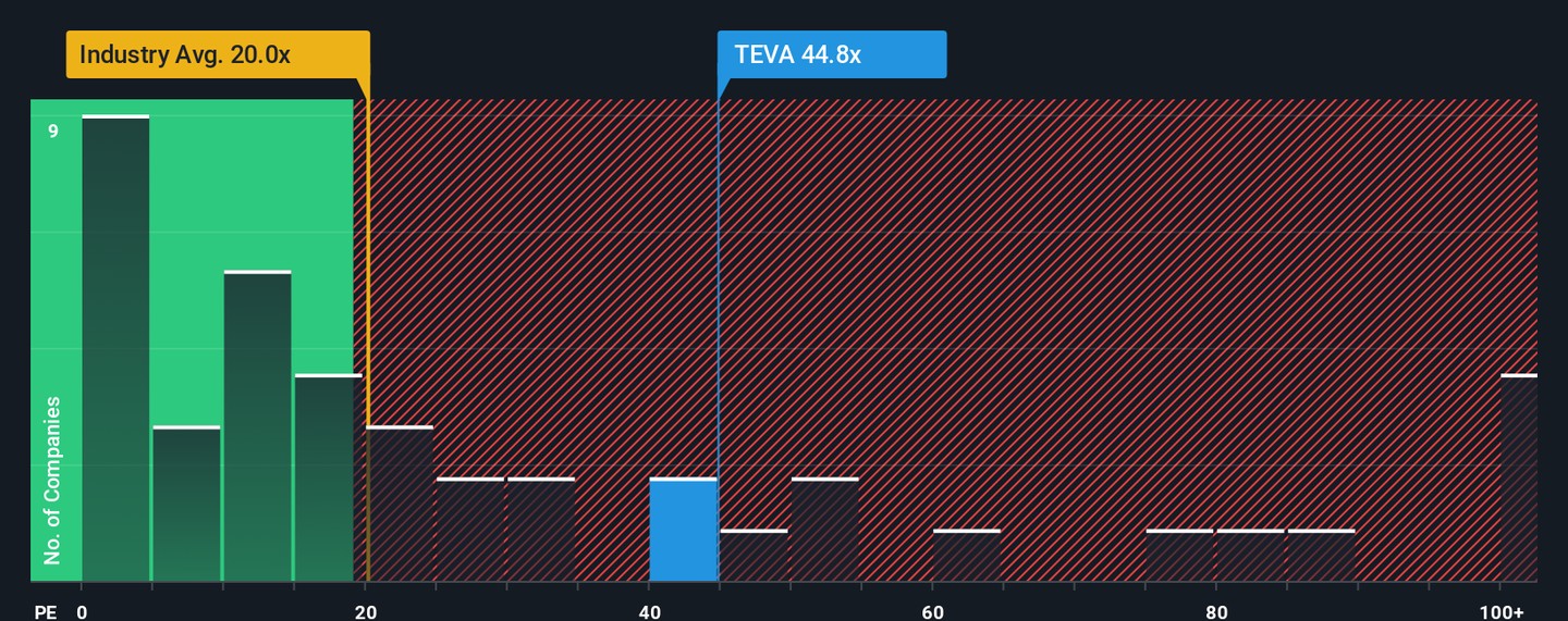 While narratives and fair value estimates point to upside, the current price tag looks stretched on earnings. Teva trades on a 44.8x price to earnings ratio, well above the US pharma average of 20x, peers at 35.9x, and even our fair ratio of 28.3x.