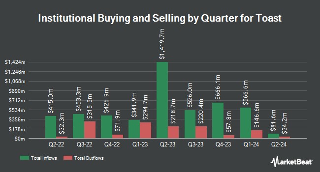 A number of other institutional investors and hedge funds also recently added to or reduced their stakes in TOST. IFM Investors Pty Ltd lifted its stake in shares of Toast by 29.2% during the 2nd quarter. IFM Investors Pty Ltd now owns 83,803 shares of the company's stock worth $3,712,000 after purchasing an additional 18,950 shares during the period. K.J. Harrison & Partners Inc acquired a new position in Toast in the second quarter valued at $1,329,000. Charles Schwab Investment Management Inc. lifted its position in Toast by 5.2% during the first quarter. Charles Schwab Investment Management Inc. now owns 3,092,210 shares of the company's stock worth $102,569,000 after buying an additional 153,723 shares during the period. Comerica Bank boosted its stake in Toast by 122.9% in the 1st quarter. Comerica Bank now owns 76,644 shares of the company's stock worth $2,542,000 after buying an additional 42,266 shares during the last quarter. Finally, Graham Capital Management L.P. grew its holdings in Toast by 373.5% in the 1st quarter. Graham Capital Management L.P. now owns 43,778 shares of the company's stock valued at $1,452,000 after buying an additional 34,532 shares during the period. 82.91% of the stock is currently owned by hedge funds and other institutional investors.