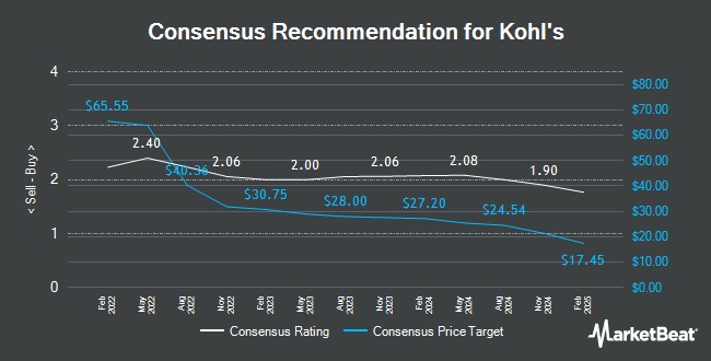 Several other research firms have also recently weighed in on KSS. Morgan Stanley lifted their target price on Kohl's from $5.00 to $9.00 and gave the company an "underweight" rating in a research note on Thursday, September 18th. JPMorgan Chase & Co. boosted their price objective on shares of Kohl's from $10.00 to $11.00 and gave the company an "underweight" rating in a research report on Thursday, August 28th. Telsey Advisory Group reiterated a "market perform" rating and issued a $23.00 price objective (up previously from $16.00) on shares of Kohl's in a research note on Tuesday, November 25th. Weiss Ratings reissued a "hold (c-)" rating on shares of Kohl's in a research note on Wednesday, October 8th. Finally, Citigroup upped their price target on shares of Kohl's from $19.00 to $23.00 and gave the stock a "neutral" rating in a research note on Wednesday, November 26th. One equities research analyst has rated the stock with a Strong Buy rating, one has assigned a Buy rating, eight have given a Hold rating and six have assigned a Sell rating to the company. According to data from MarketBeat, the stock has a consensus rating of "Reduce" and an average price target of $15.18.