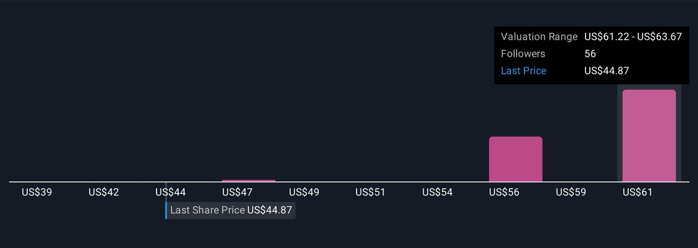 Earlier we mentioned that there is an even better way to understand valuation. Let us introduce you to Narratives, a simple tool on Simply Wall St’s Community page that lets you write the story behind your numbers by linking your view of Copart’s business, its future revenue, earnings and margins, to a concrete financial forecast and implied fair value. You can then compare this to today’s share price to decide whether it looks like a buy or a sell. The platform dynamically updates your Narrative as new information like earnings or news arrives. One bullish Copart investor might project international expansion, digital auction growth and share repurchases supporting a fair value closer to the recent analyst high of about $65. A more cautious investor, focused on insurance headwinds and competitive pressure, could reasonably anchor their Narrative nearer the low end around $46. This shows how different perspectives on the same company can coexist, each grounded in an explicit, testable forecast rather than a vague “it feels cheap” or “it looks expensive” judgment.