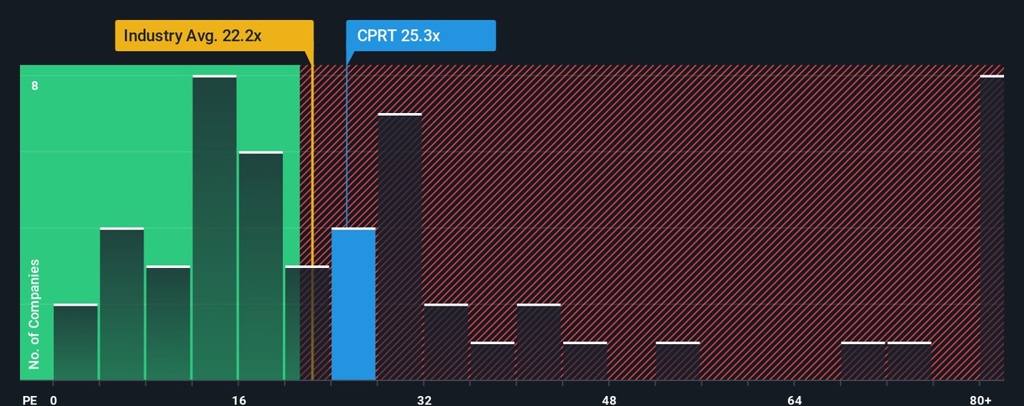 Copart currently trades on a PE of about 23.6x, which is slightly above the broader Commercial Services industry average of around 23.0x, but below the 34.5x average of its closer peers. To move beyond these blunt comparisons, Simply Wall St uses a proprietary Fair Ratio, which estimates the PE Copart might trade on given its earnings growth, profit margins, industry, market cap and risk profile. This Fair Ratio for Copart is 28.6x, suggesting the stock could warrant a higher multiple than it currently commands.