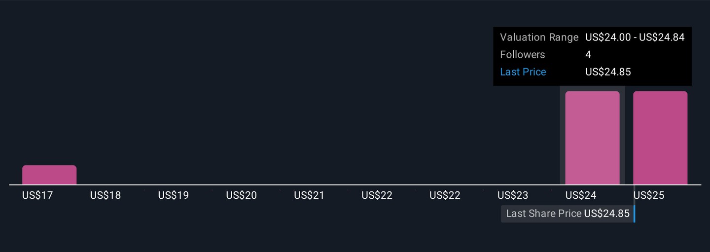 Three members of the Simply Wall St Community value Mirion between US$17.35 and US$33.74 per share, highlighting a wide spread of expectations. When you set those views against Mirion’s reliance on acquisitions to drive growth, it is worth exploring how different assumptions about integration risks and future deal making could affect the business over time.