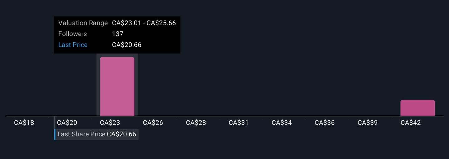 Earlier we mentioned that there is an even better way to understand valuation, so let us introduce you to Narratives, a simple framework on Simply Wall St’s Community page that lets you describe the story you see for TELUS, turn that story into a financial forecast for revenue, earnings and margins, and then convert it into a fair value you can compare to today’s share price to decide whether to buy, hold or sell. Narratives are easy to use, dynamically update as new news or earnings arrive, and make it clear how two investors can look at the same company and disagree. For example, one TELUS Narrative might assume strong broadband, 5G and digital health growth and arrive at a fair value near CA$30, while a more cautious Narrative focused on regulatory and debt risks might land closer to CA$20. This gives you a transparent, numbers backed way to choose which outlook you believe and act on it with confidence.
