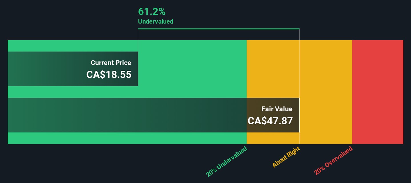 When all these projected cash flows are discounted back to today, the model arrives at an intrinsic value of about CA$47.87 per share. Compared with the recent share price around CA$18.55, this suggests TELUS may be trading at roughly a 61.2% discount to its DCF-based fair value, indicating the market could be heavily discounting its long term cash generation.