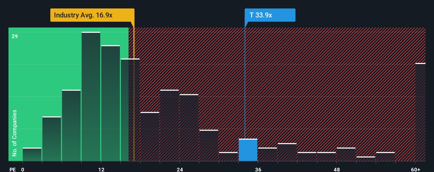 TELUS currently trades on a PE of about 24.4x, which is above both the wider Telecom industry average of roughly 16.2x and the peer group average of about 8.8x. On the surface, that could suggest TELUS is priced at a premium to its sector. However, Simply Wall St’s proprietary Fair Ratio for TELUS is 12.7x, which estimates what a reasonable PE might be once you factor in its specific earnings growth outlook, profitability, industry position, market cap, and risk profile.