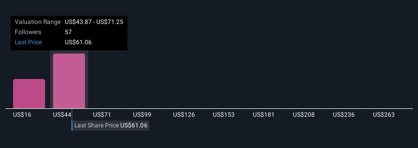 Earlier we mentioned that there is an even better way to understand valuation, so let us introduce you to Narratives, a simple way to connect your view of a company’s story to the numbers behind it. A Narrative is your structured perspective on a business, where you spell out how you think revenue, earnings and margins will develop, what fair value that implies, and why. On Simply Wall St, Narratives live in the Community page and are used by millions of investors as an easy, accessible tool that links three things together: the company’s story, a full financial forecast, and a resulting fair value estimate. Once you have a Narrative, you can quickly compare its Fair Value to the current market price to decide whether Figma looks like a buy, a hold or a sell, and that view updates dynamically as new information like earnings, news or guidance comes in. For example, within the current range of Figma Narratives on the platform, the most optimistic fair value assumes sustained high growth and margins, while the most cautious assumes faster competitive pressure and slower adoption.