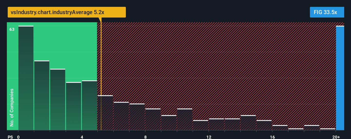 Figma currently trades on a P/S of about 19.11x, which is almost four times the broader Software industry average of roughly 4.91x and well above its peer group average of about 10.21x. To move beyond these blunt comparisons, Simply Wall St uses a proprietary “Fair Ratio” for the P/S multiple. This represents the level you might expect once factors like Figma’s growth outlook, profit margins, risk profile, industry and even market cap are all accounted for.