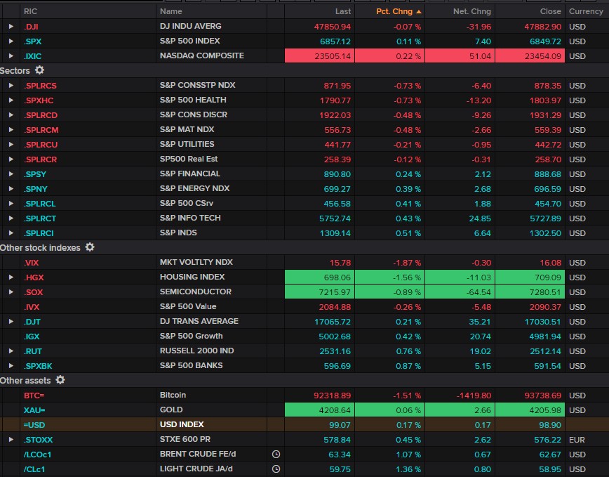 Wall Street ended mostly flat with Nasdaq and S&P 500 slightly up, while Dow edged down. Industrials led S&P sector gains, healthcare and consumer staples were weakest. Dollar and gold rose, U.S. crude gained over 1%, and bitcoin fell over 1%. The U.S. 10-Year Treasury yield increased to around 4.10%. Investors await the Federal Reserve meeting next week amid mixed economic data.