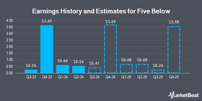 Five Below (NASDAQ:FIVE - Get Free Report) last released its earnings results on Wednesday, December 3rd. The specialty retailer reported $0.68 earnings per share (EPS) for the quarter, topping the consensus estimate of $0.22 by $0.46. Five Below had a return on equity of 17.13% and a net margin of 6.45%.The firm had revenue of $1.04 billion during the quarter, compared to analysts' expectations of $971.96 million. During the same quarter last year, the business posted $0.42 earnings per share. Five Below has set its FY 2025 guidance at 5.710-5.890 EPS and its Q4 2025 guidance at 3.360-3.540 EPS. As a group, research analysts anticipate that Five Below will post 4.93 earnings per share for the current year.