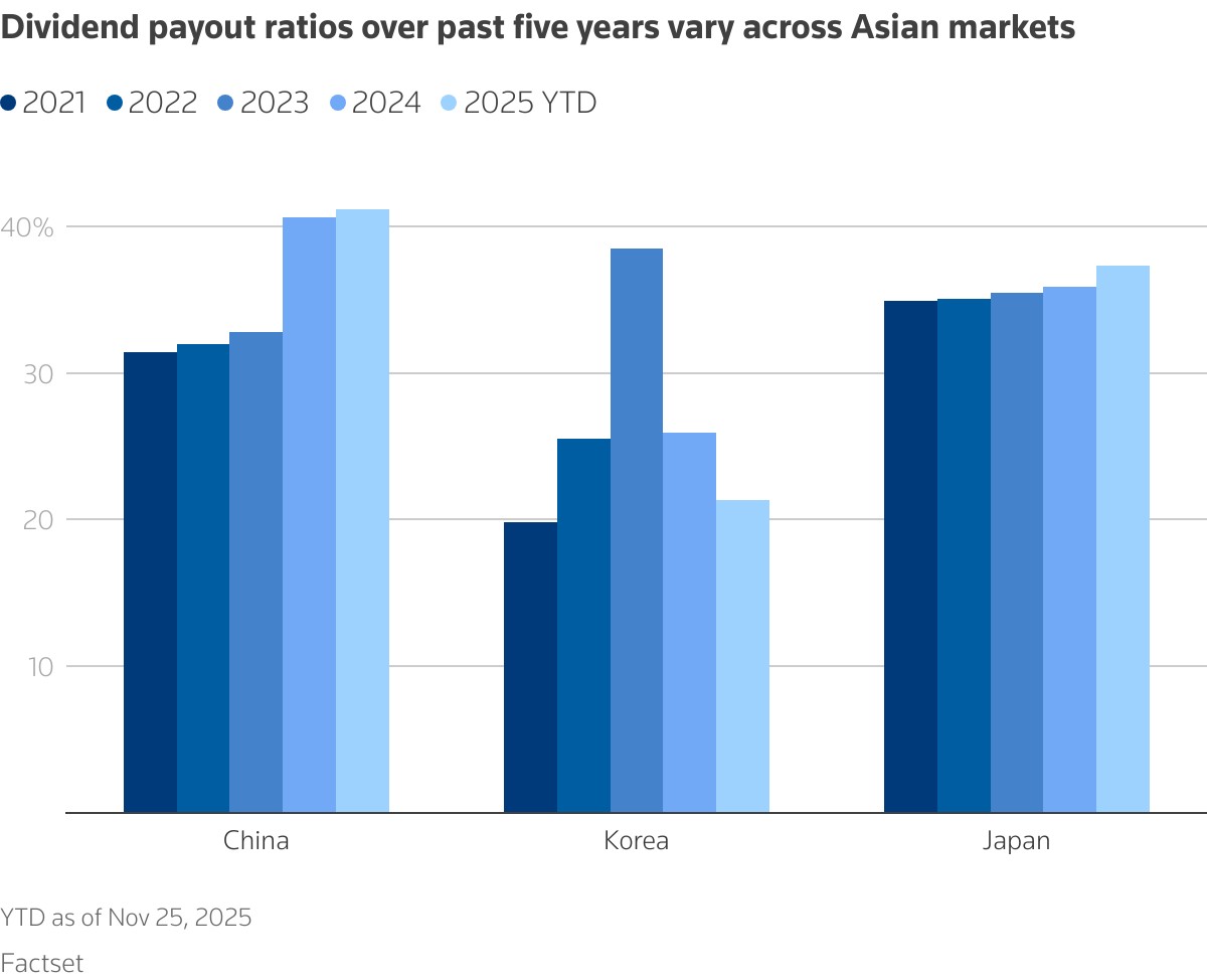 The results have been uneven. China’s average dividend payout ratio has risen sharply over the past three years, while Japan’s has moved more modestly. South Korea’s payouts jumped initially but subsequently declined.