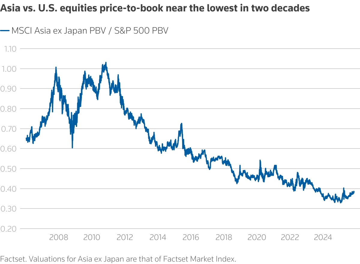 Asia ex Japan Price-to-book relative to that of S&P500 near it lowest in two decades