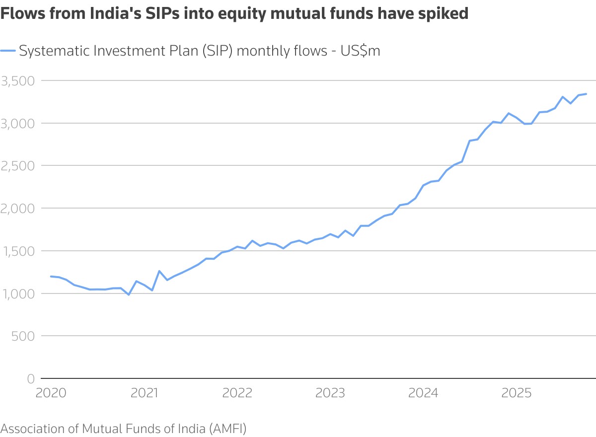 Governments have also stepped in to steer domestic savings toward equities. In China, low interest rates and a collapsing property sector had already begun to push domestic investors towards stocks. The authorities added a further nudge in January by encouraging state insurance companies to invest 30% of premium income in equities. It is still early days, but the effect is visible: insurers’ equity allocations rose from 12% of assets at the start of the year to 15.5% by the third quarter, helping to drive a 14% rally in China’s CSI300 index. The biggest success story for domestic investment is India. Financialization of savings began in 2014 with the introduction of basic bank accounts under a scheme designed to provide every household with access to financial services. Ultimately, this paved the way for gigantic, steady domestic investments into mutual funds through systematic investment plans (SIPs), which now exceed $3 billion a month. In contrast, Korea’s efforts, like lowering banks’ risk weights on equity investments, have failed to redirect domestic savings. The market remains driven by foreign money. Record-high net foreign institutional investor flows of $17.7 billion since 2023 contrast with persistent domestic outflows into U.S. stocks and ETFs, according to consultancy ETFGI. However, Korean equities’ surge in the first half of 2025 suggests some policy measures are starting to bear fruit.