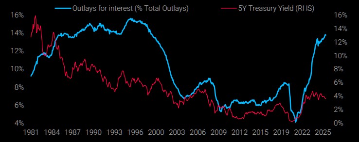The U.S. Treasury cannot bear the rising cost of financing: interest payments now account for about 14% of federal spending. In the early 1990s, this ratio was higher, but at that time, the five-year Treasury yield was 6.1%, while it is now only 3.7%. Although it seems unlikely that yields will rise to 6%, if economic growth and inflation accelerate again, and the market expects interest rate hikes even under the guidance of the Federal Reserve, then a steepening of the yield curve will be inevitable.
