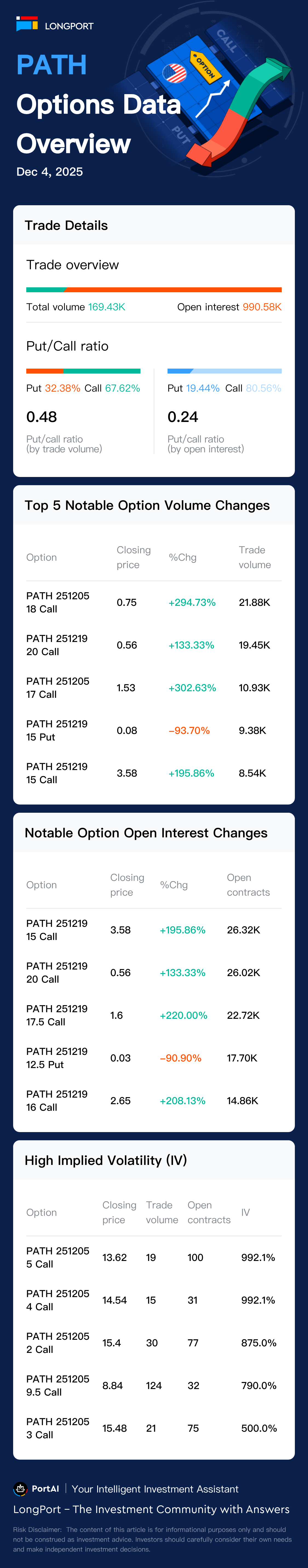 On December 4, Eastern Time, UiPath options saw a total of 169432 contracts traded, with calls accounting for 67% and puts making up 32%.