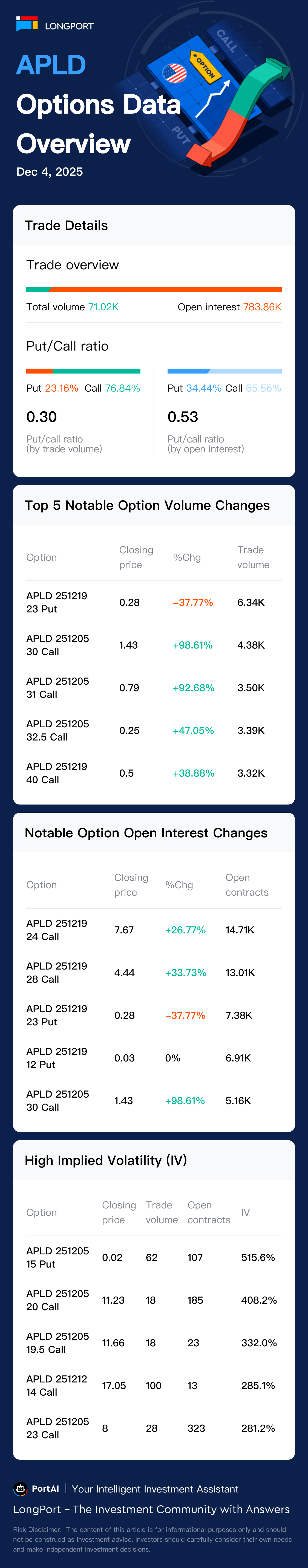 On December 4, Eastern Time, Applied Digital options saw a total of 71019 contracts traded, with calls accounting for 76% and puts making up 23%.