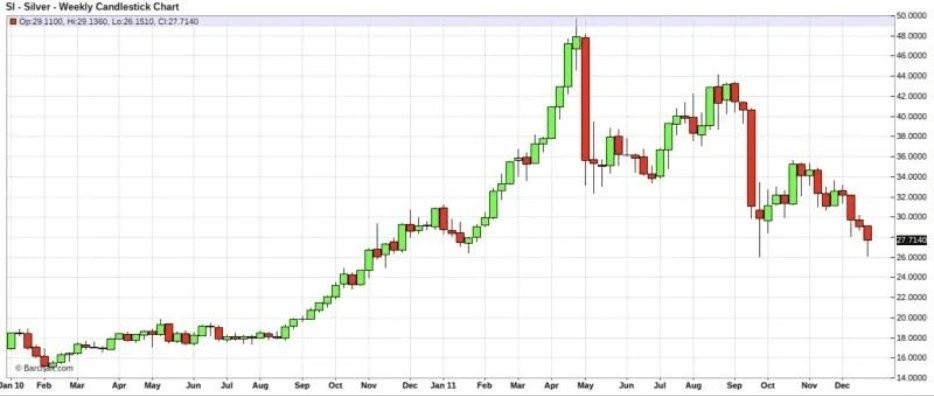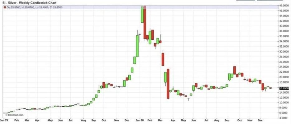 In 1980, silver skyrocketed from $10 to $48 in four months, but two months later, it fell back to $10.
