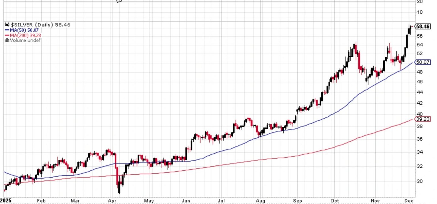 He expects the real breakthrough for silver to occur in early 2026. "Just like gold two years ago, silver is consolidating and bottoming near historical highs." If a breakthrough occurs next year, similar to gold's doubling since March 2024, silver could reach $100 per ounce in the mid to late 2027.