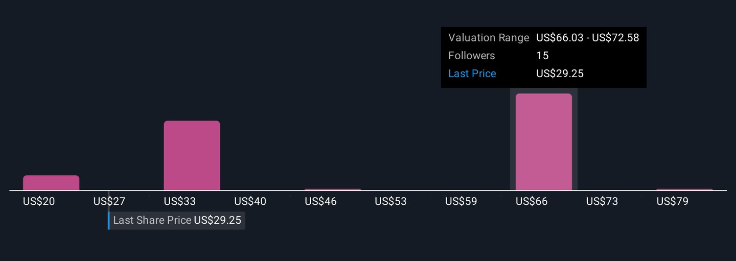 The Simply Wall St Community’s seven fair value estimates for Amentum stretch from US$20.24 to US$85.66, underscoring how differently individual investors are sizing up its prospects. Set that against a business that has only just turned profitable and still faces questions over interest coverage and execution on large, complex contracts, and you can see why opinions diverge so sharply. Exploring several of these viewpoints can help you judge whether recent earnings progress offsets those lingering risks.