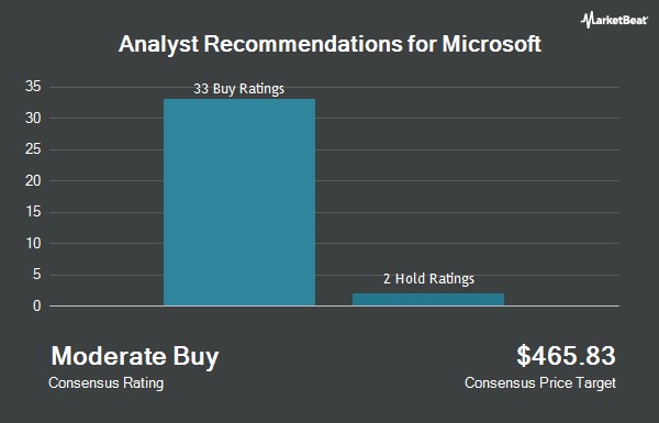 Microsoft Corporation (NASDAQ:MSFT - Get Free Report) has earned a consensus rating of "Moderate Buy" from the forty-three ratings firms that are currently covering the company, Marketbeat.com reports. Four research analysts have rated the stock with a hold rating, thirty-seven have given a buy rating and two have given a strong buy rating to the company. The average 1-year price objective among brokers that have issued a report on the stock in the last year is $634.3333.