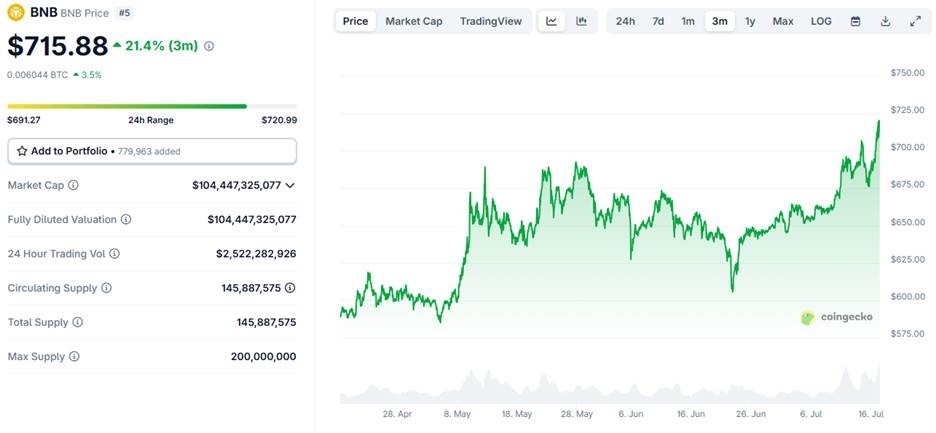 The news has pushed BNB’s price above $715, marking a notable 3.5% gain within 24 hours.