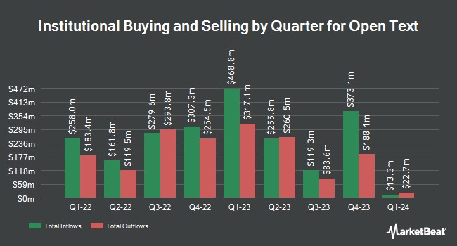 Other large investors have also recently bought and sold shares of the company. Arkadios Wealth Advisors bought a new position in shares of Open Text during the first quarter worth $299,000. Natixis Advisors LLC raised its holdings in Open Text by 15.0% during the 1st quarter. Natixis Advisors LLC now owns 47,243 shares of the software maker's stock worth $1,193,000 after buying an additional 6,168 shares during the period. Vanguard Group Inc. lifted its stake in Open Text by 6.1% in the first quarter. Vanguard Group Inc. now owns 11,151,279 shares of the software maker's stock valued at $281,447,000 after buying an additional 639,514 shares in the last quarter. ASR Vermogensbeheer N.V. acquired a new position in shares of Open Text in the first quarter valued at approximately $3,533,000. Finally, Charles Schwab Investment Management Inc. increased its position in shares of Open Text by 0.6% during the first quarter. Charles Schwab Investment Management Inc. now owns 681,623 shares of the software maker's stock worth $17,201,000 after acquiring an additional 3,914 shares in the last quarter. Institutional investors own 70.37% of the company's stock.