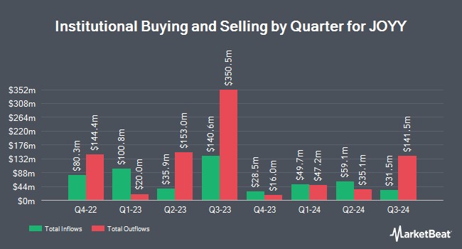 A number of other large investors have also modified their holdings of YY. BRIGHT VALLEY CAPITAL Ltd boosted its stake in shares of JOYY by 249.2% during the 1st quarter. BRIGHT VALLEY CAPITAL Ltd now owns 1,312,841 shares of the information services provider's stock worth $55,113,000 after acquiring an additional 936,841 shares in the last quarter. Prudential PLC acquired a new position in JOYY in the 1st quarter worth about $44,090,000. Canada Pension Plan Investment Board boosted its position in JOYY by 23.7% during the first quarter. Canada Pension Plan Investment Board now owns 528,273 shares of the information services provider's stock worth $22,177,000 after purchasing an additional 101,173 shares in the last quarter. Nuveen LLC acquired a new stake in JOYY in the first quarter valued at approximately $16,926,000. Finally, LSV Asset Management grew its holdings in JOYY by 1.6% in the second quarter. LSV Asset Management now owns 349,299 shares of the information services provider's stock valued at $14,513,000 after purchasing an additional 5,400 shares during the period. Institutional investors and hedge funds own 36.83% of the company's stock.
