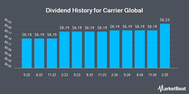Carrier Global Corporation (NYSE:CARR - Get Free Report) announced a quarterly dividend on Wednesday, December 3rd. Investors of record on Tuesday, January 20th will be paid a dividend of 0.24 per share on Monday, February 9th. This represents a c) annualized dividend and a dividend yield of 1.8%. The ex-dividend date of this dividend is Tuesday, January 20th. This is a 6.7% increase from Carrier Global's previous quarterly dividend of $0.23.