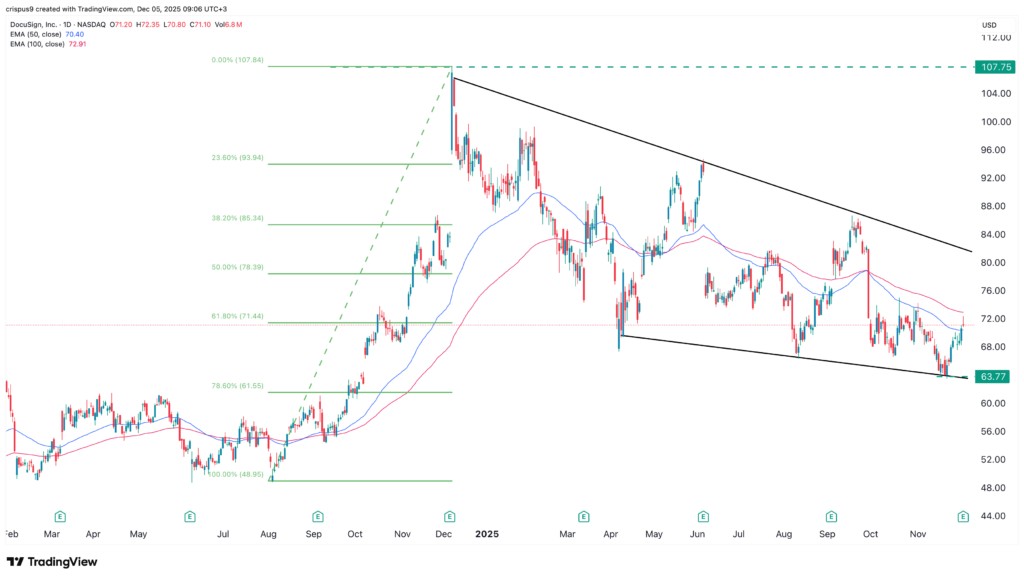 The daily timeframe chart shows that the DOCU stock price has been in a strong downward trend this year. It dropped from the November high of $107.75 to the current $71.