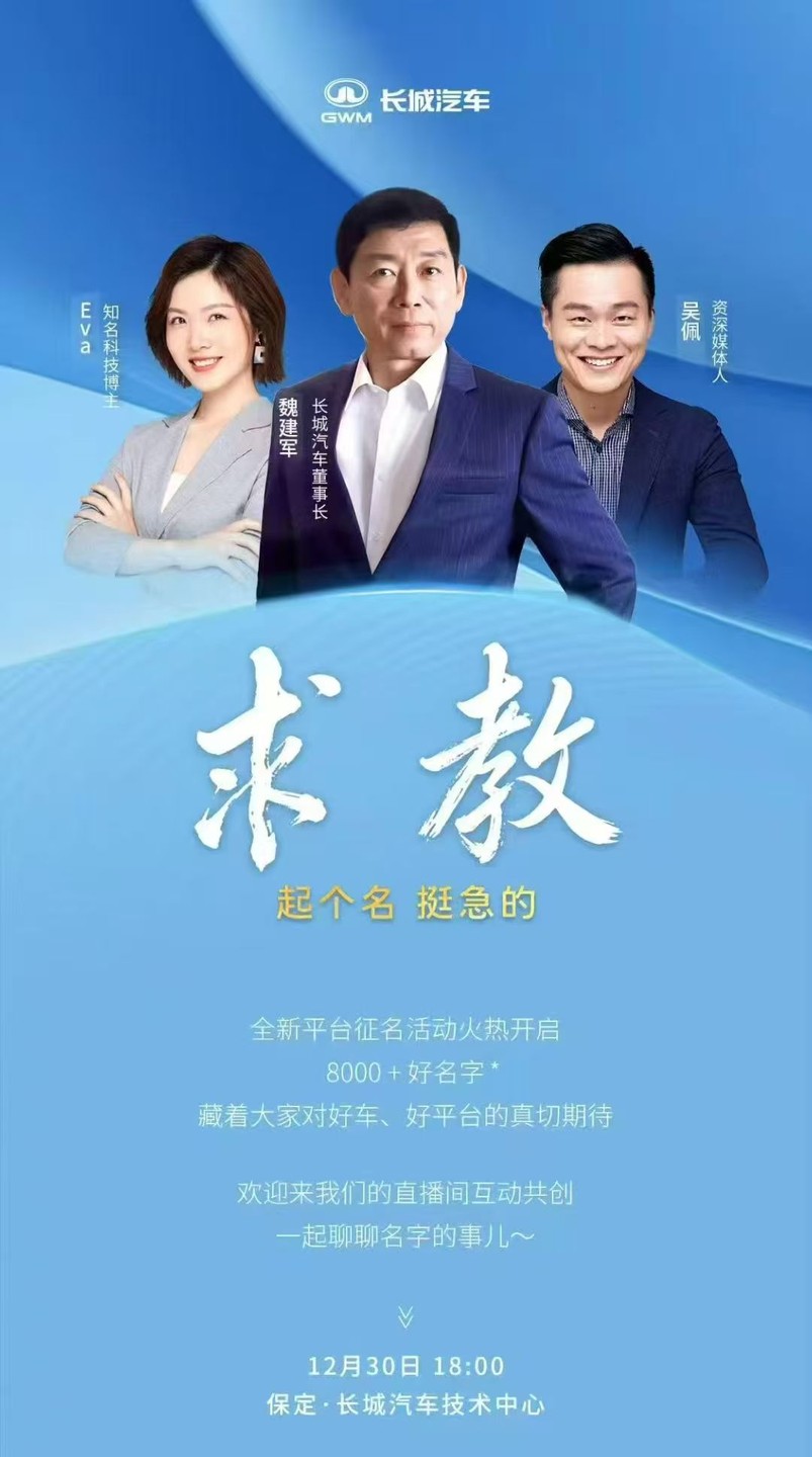 DoNews reported on December 30th that Great Wall Motor President Wei Jianjun announced on social media that he will hold a live broadcast today at 18:00 to discuss the naming issue of the multi-power platform of Great Wall Motor.