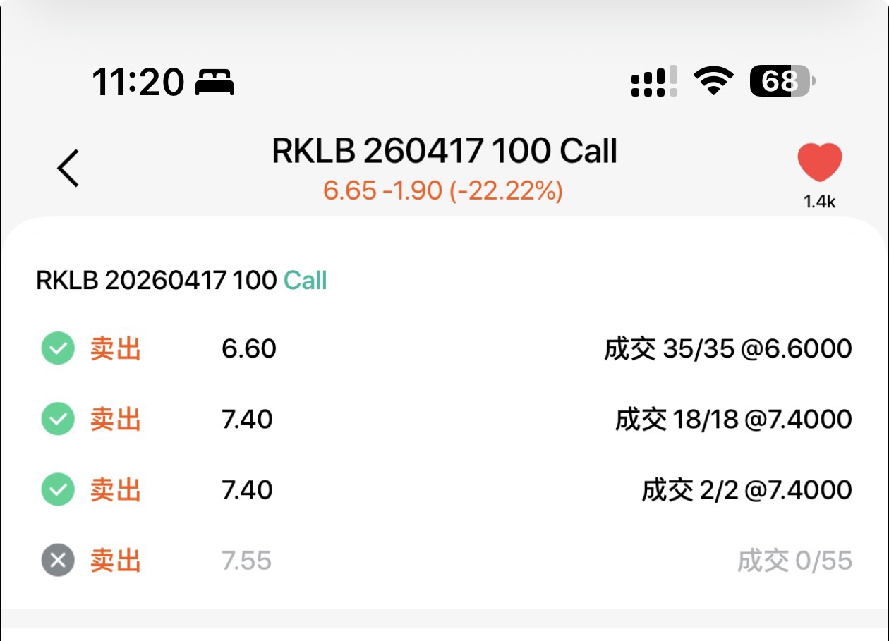 $Rocket Lab(RKLB.US) liquidated. This trade call made a profit of 6.5w usd. Not bad. Next focus on hood call $Robinhood(HOOD.US)