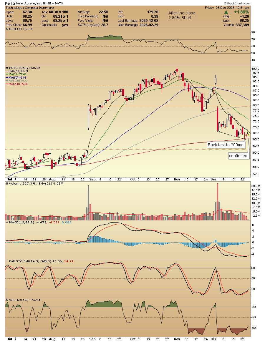 $Pure Storage(PSTG.US) daily holding the 200ma daily and reversal confirmed so far. I will like this trade better once price is over the 10ema.