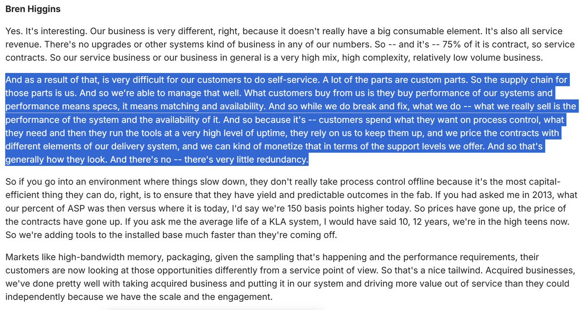 KLA's service business accounts for 25% of its revenue and grew at 13% CAGR between 2020 and 2025. KLA maintains it will grow at 12-14% in CY26 too. Unlike Lam and others, KLA doesn't include mature n...