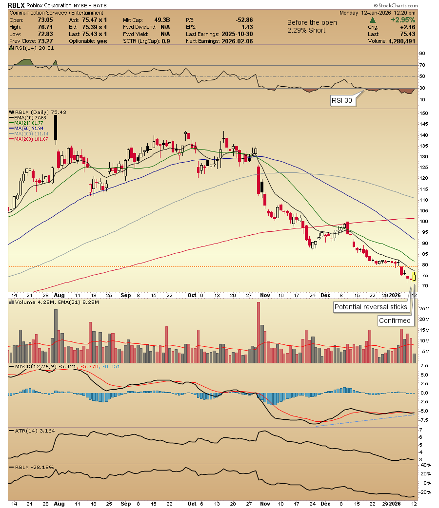 $Roblox(RBLX.US) reversing off recent lows. Might just be a bounce or it might be a start of something good. A move over the 10ema daily and then the recent gap are levels I am watching. Clear risk ...