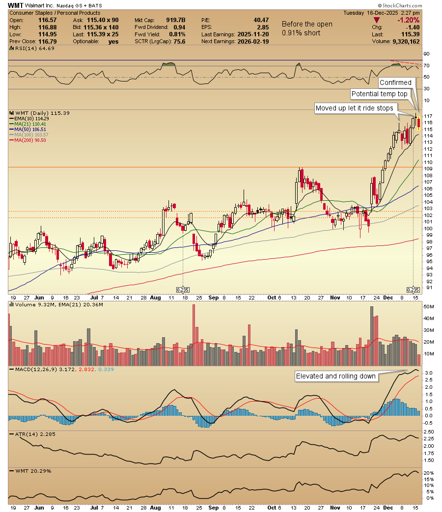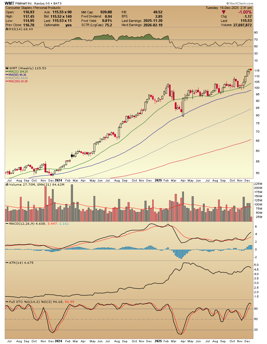 ......$Walmart(WMT.US) weekly we are early in the week but note the red stick indicating a temp top on the weekly at elevated RSI. Note that since my buy in Dec 2023 price has ridden the 50ma and the 21ma. ...
