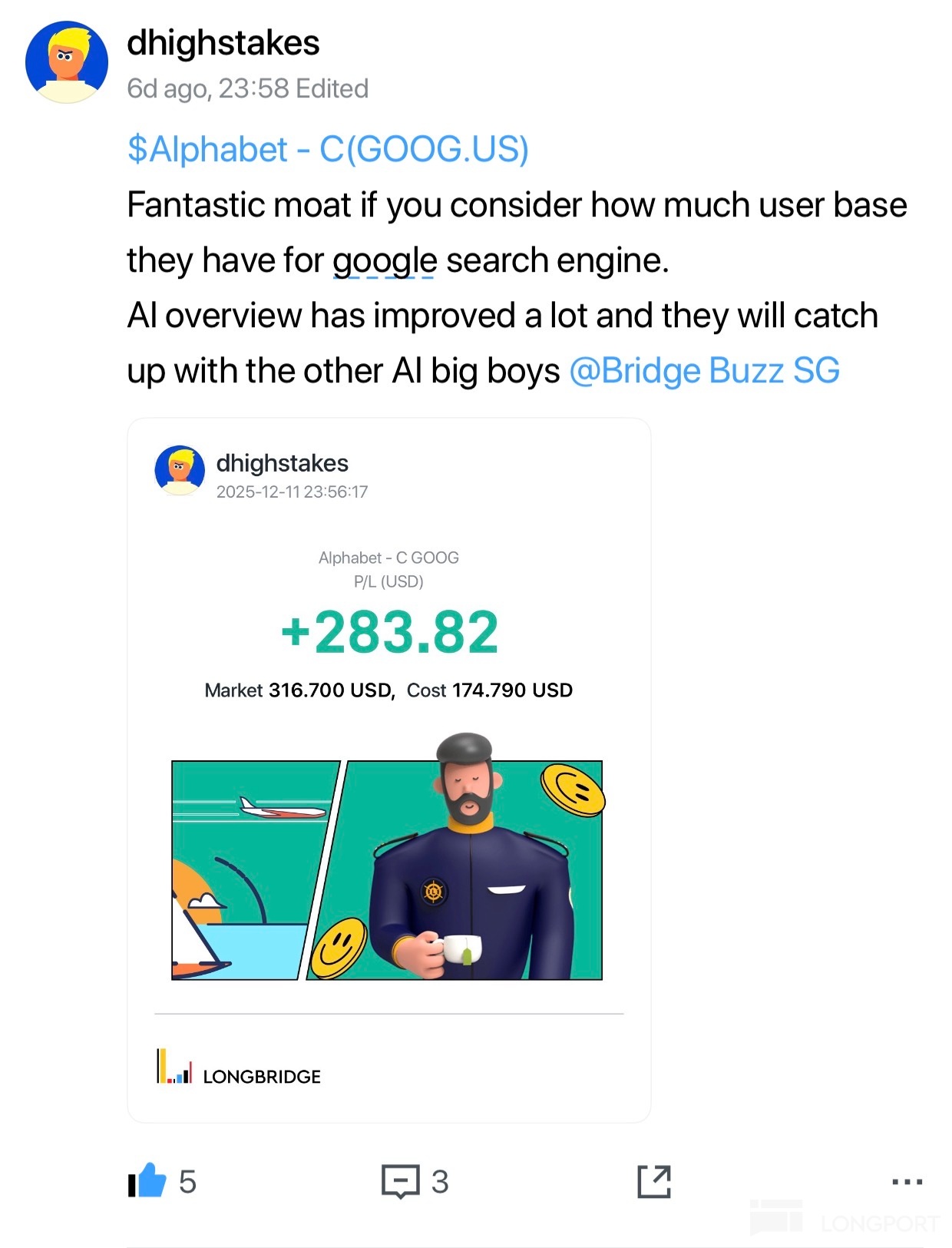 Shares a view on $Alphabet - C(GOOG.US), citing its vast search user base as a competitive moat and noting improvements in its AI capabilities.