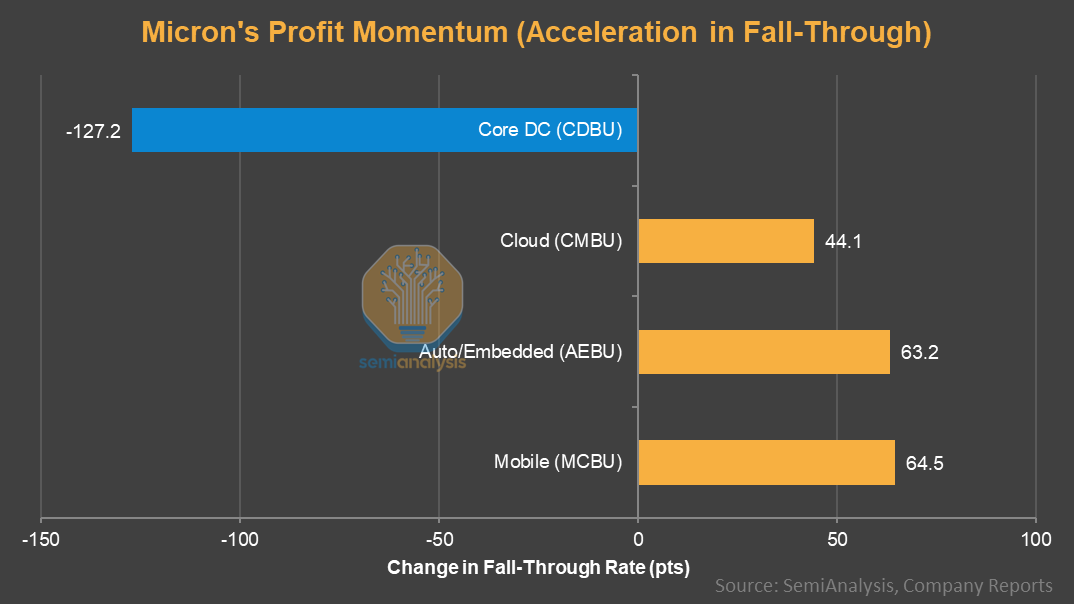 Micron now discloses GM and OPM for each segment including Mobile, Cloud, Auto and Core DC. Measuring GM fall-through (incremental GP/incremental rev) across 3 disclosed periods (3QF25 through 1QF26) suggests Mobile gross profit is accelerating (not surprising with all the news we hear about mobile squeeze). Cloud (AI) and Auto accelerating too. Core DC appears decelerating.