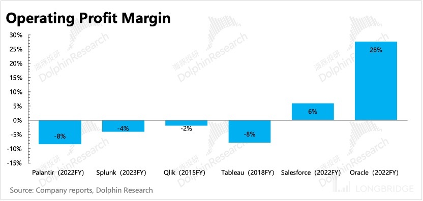 In static comparison, the marginal rate of return of Palantir is higher than that of Qlik 8 years ago and Tableau 5 years ago. However, in terms of the front and back trends of the three peers, Splunk (continuous improvement) is significantly better than Qlik (sharp fluctuations) and Tableau (continuous decline).