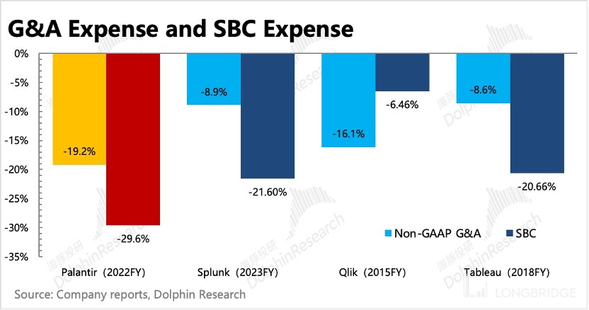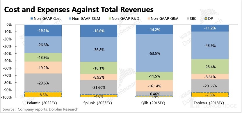 If you take a closer look at the cost distribution of P, S, and Q, you will find that in addition to the constant investment required in technology, the three still have another common high expenditure item-marketing and promotion costs. The Non-GAAP sales expense rates for Palantir(2022FY), Splunk(2023FY), Qlik (pre-delisting, 2015FY) and Tableau (pre-delisting, 2018FY) reached 26.6 percent, 36.8 percent, 53.5 percent and 43.9 percent, respectively.