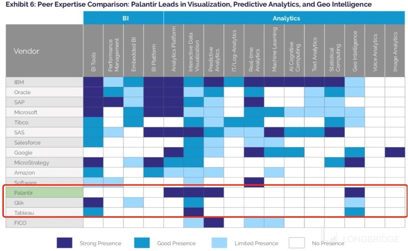 However, from the peer comparison in the figure below, it is more accurate to say that the Palantir's advantages are focused on the latter's "analysis", which is manifested in data visualization, predictive analysis, and geospatial intelligence (e. g., collecting and integrating various types of data to predict potential natural disasters). Of course, other sectors in big data analysis, Palantir also have more or less some products involved. Companies that also have a competitive advantage in the analysis process are mainly giants in the industry such as IBM, Oracle, SAP, Microsoft, etc. In addition to Tableau having the same strong competitive advantage in data visualization, vertical companies do not have the ability to compete directly with Palantir in other aspects. Therefore, in terms of product power, Palantir most direct competitors are actually the giants of the industry.