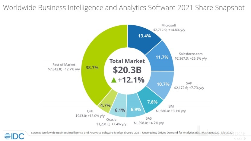 According to IDC's 2021 data, the main share of BIA market is in the hands of software giants such as Microsoft, Salesforce, SAP and IBM. Although these giants may not be "specialized" in specific fields, these giants can quickly reach users with their original product advantages from the perspective of universal requirements. In the vertical category, Qlik currently has a relatively high share, with a market share of 4.7 per cent, although it is Palantir to have a market share of 3.2 per cent in 2021.