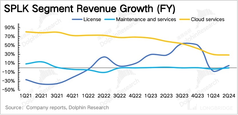For example, from the income structure of Splunk, it can be seen that the growth rate of Cloud subscription income in the subdivided business keeps steady convergence with the expansion of scale, but the License income is highly related to whether there is a contract increment in the current period, therefore, there will be sharp fluctuations in the growth rate.