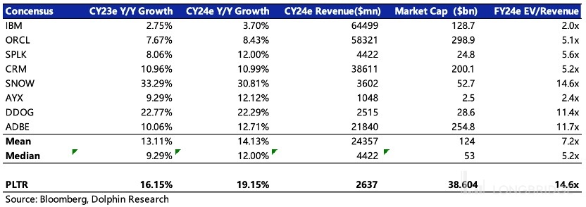 Although we say that AI is a very key growth driver for Palantir in the future, due to the current fierce competition in the field of data management, Palantir its own AI platform has not yet begun to be formally commercialized, Dolphin Jun believes that from a margin of safety, there is no need to rush into the expectation of entering too many non-core markets immediately at the moment. In other words, in the commercial sector, we still determine the Palantir growth space according to the core market size above ($46 billion, of which government 10.4 billion and commercial 35.6 billion).