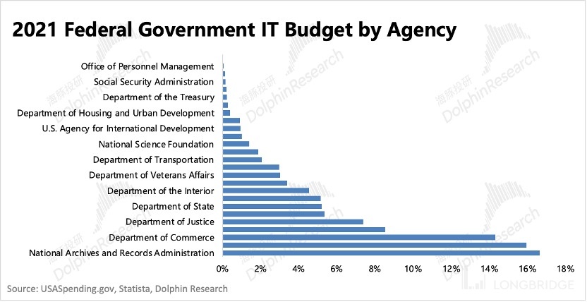 For the international market, Dolphin believes that although Palantir does have contract forms from Europe, Australia and other countries, due to increasing attention to homeland security and data privacy issues, it is not ruled out that more countries, like France, will choose to replace Palantir after the expiration of the existing contract. Therefore, it is reasonable to consider the real TAM only as the US market. In the U.S. government, due to the obvious advantages of Palantir, the real TAM mainly depends on how much budget government departments can actually spend on big data analysis. In terms of spending in fiscal year 2021 (2020.9-2021.9), the federal government's IT spending accounted for only 1 percent of total spending, and just before the epidemic period of the fiscal deficit, it also reached 1.5 percent. Among the institutional departments with clear IT investment budgets, the highest proportion is mainly the National Archives Department, the Nuclear Regulatory Commission and the Ministry of Commerce, which can reach about 15%, but the proportion of IT expenditure in most other departments is less than 5%.