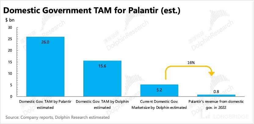 It is expected that the proportion of government IT expenditure will increase moderately.First, look at the potential market space of government agencies. Palantir, when estimating TAM, it is divided into the international market (US $37 billion) and the US domestic market (US $26 billion), I .e. assuming that 5% of the total government expenditure is spent on IT investment, and then give a percentage weight to the areas that it can reach.